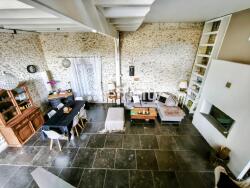 Alliant le confort d'une rénovation moderne au charme de l'ancien, la bâtisse révèle ses pierres d'origine aves ses murs et ses passages de portes cintrées en forme d'arcade en anse de panier, ses poutres apparentes, son sol en pierre bleue (3 cm) et de magnifiques volumes, dont un salon doté de 6 m de hauteur sous plafond.