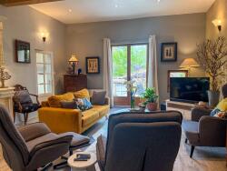 Le bureau mène à un salon d'hiver confortable, équipé d'un poêle à bois et doté de portes de chaque côté, donnant sur le bureau à droite et sur le patio couvert à gauche, ainsi qu'un accès direct au hall d'entrée. Cette pièce ne possède pas de fenêtres extérieures, ce qui en fait un cocon idéal pour l'hiver. Les colombages apparents et l'ancienne colonne en pierre sur un mur lui confèrent un caractère unique, et ici encore, les murs sont d'un jaune ensoleillé qui apporte de la luminosité.