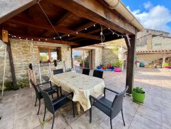 Propriété de village (180m) entièrement rénovée, avec grand jardin (3500m2), double garage, atelier, piscine hors sol et parking pour plusieurs voitures.