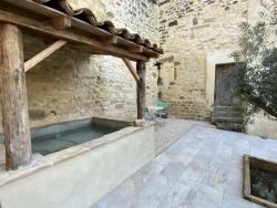 Maison de village en pierre avec terrain et piscine.