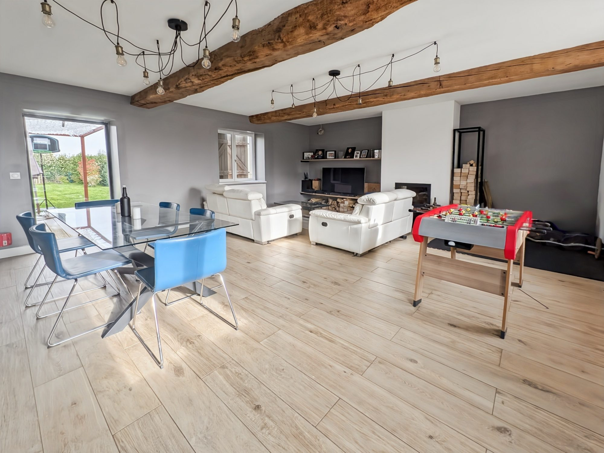 Pièce de vie traversante de 47 m2 avec cuisine moderne ouverte
