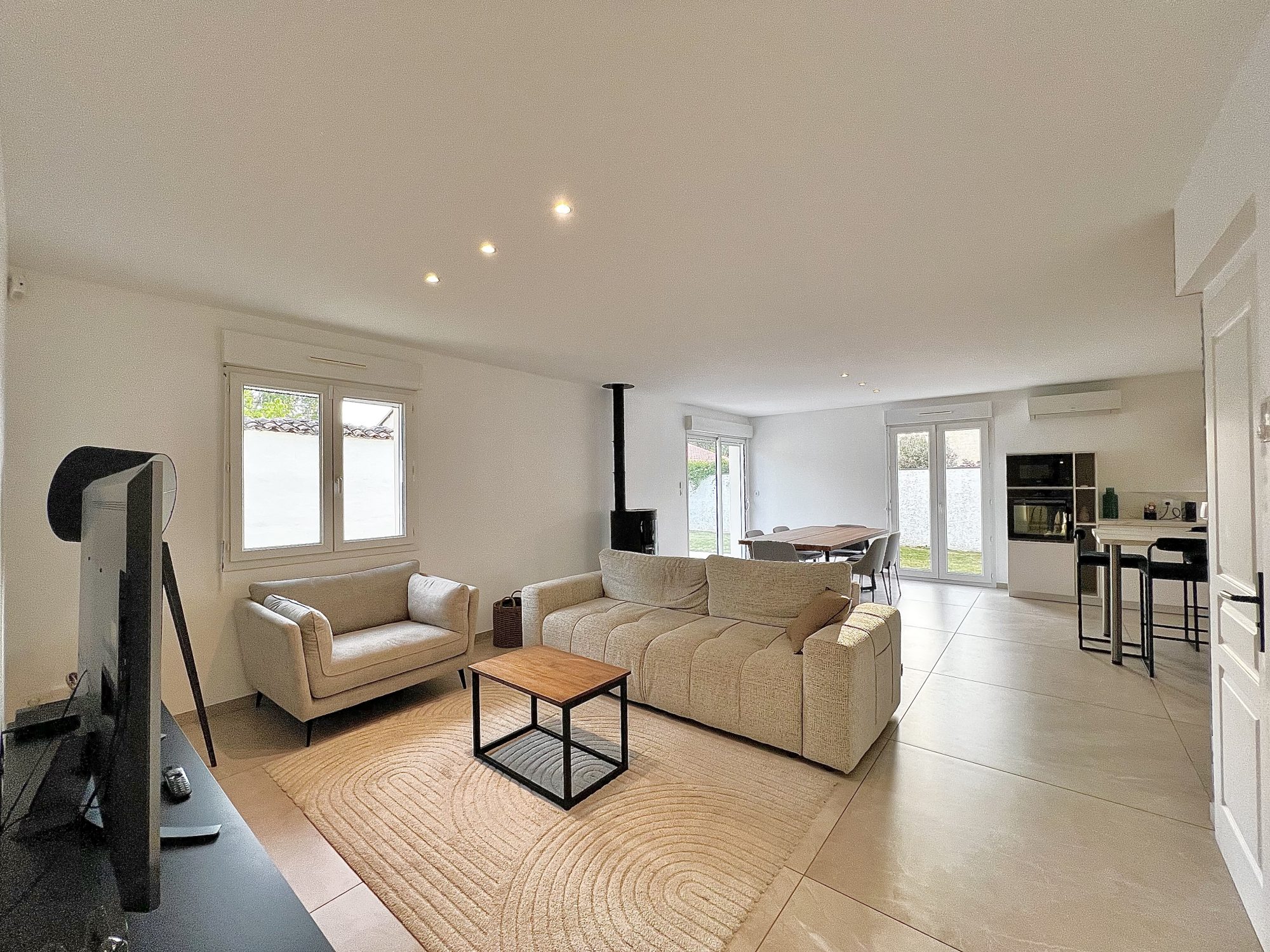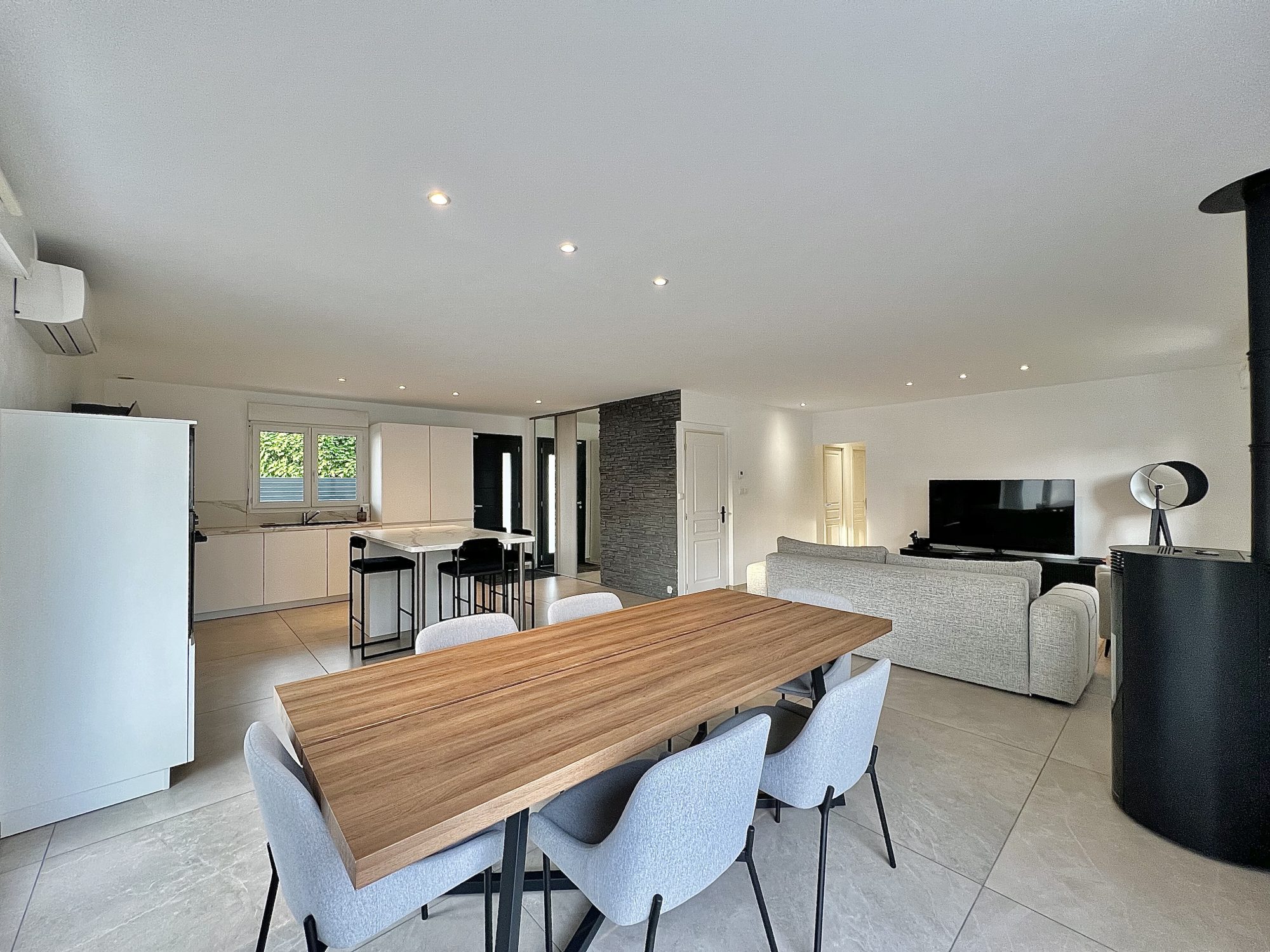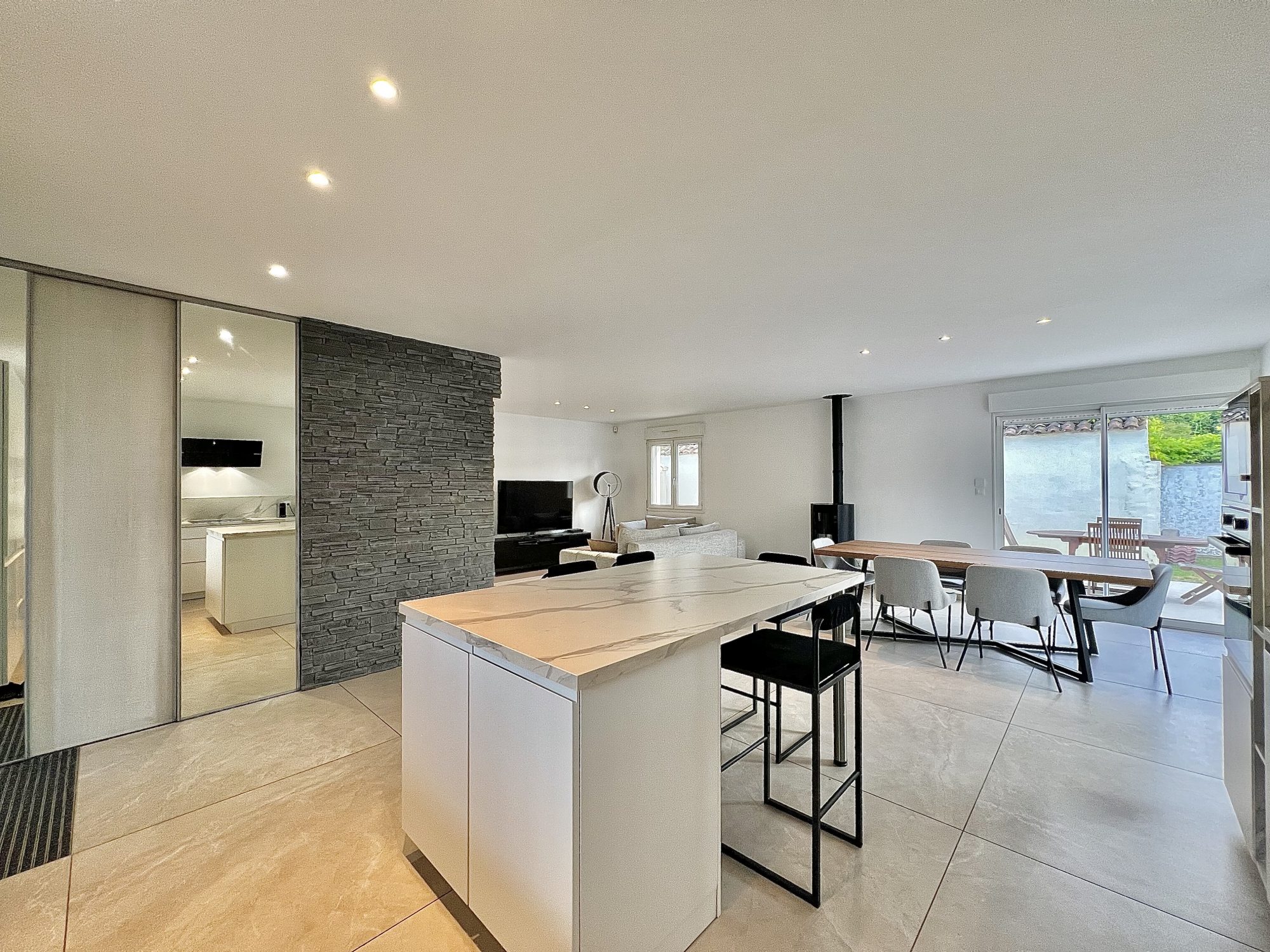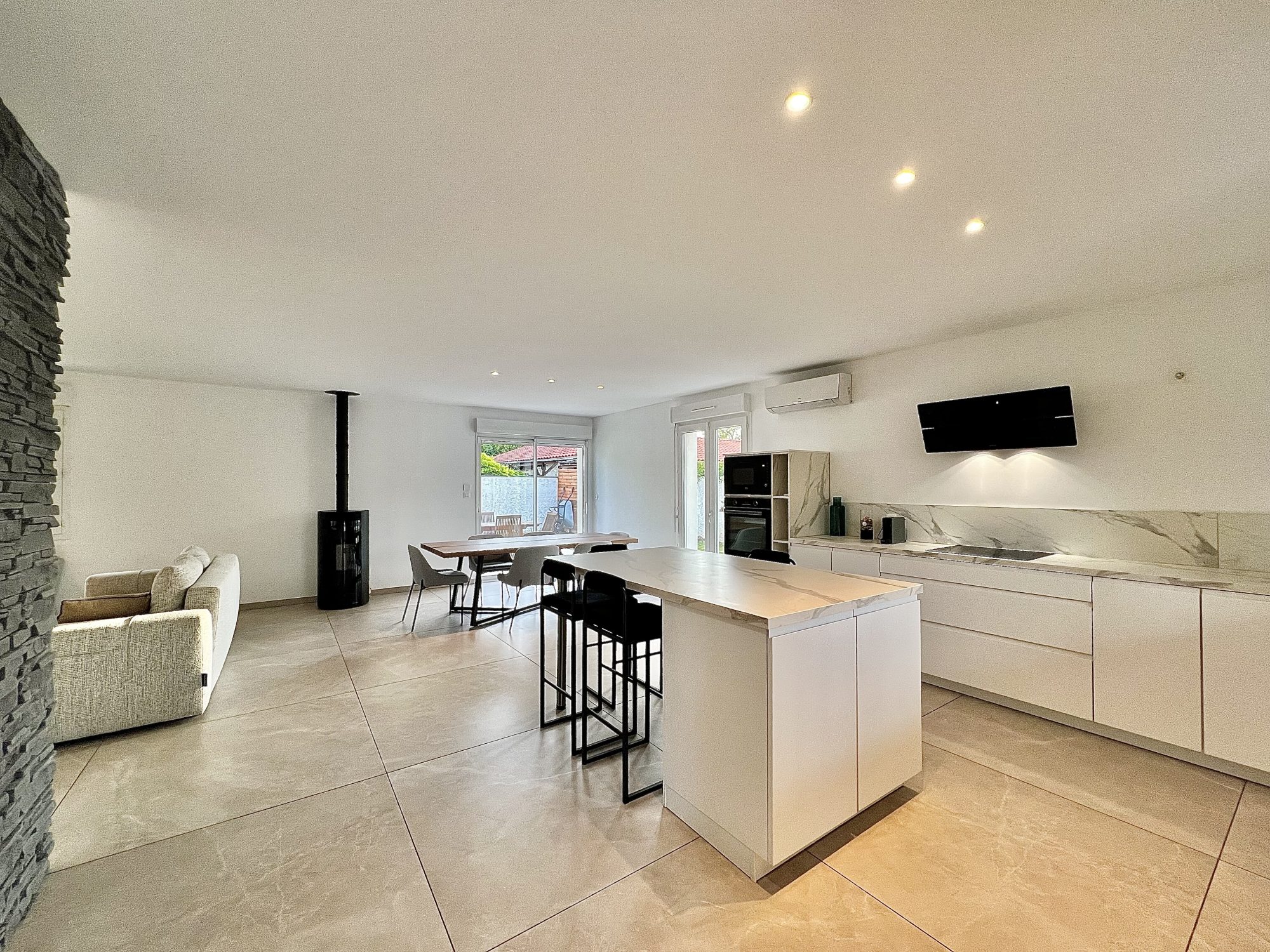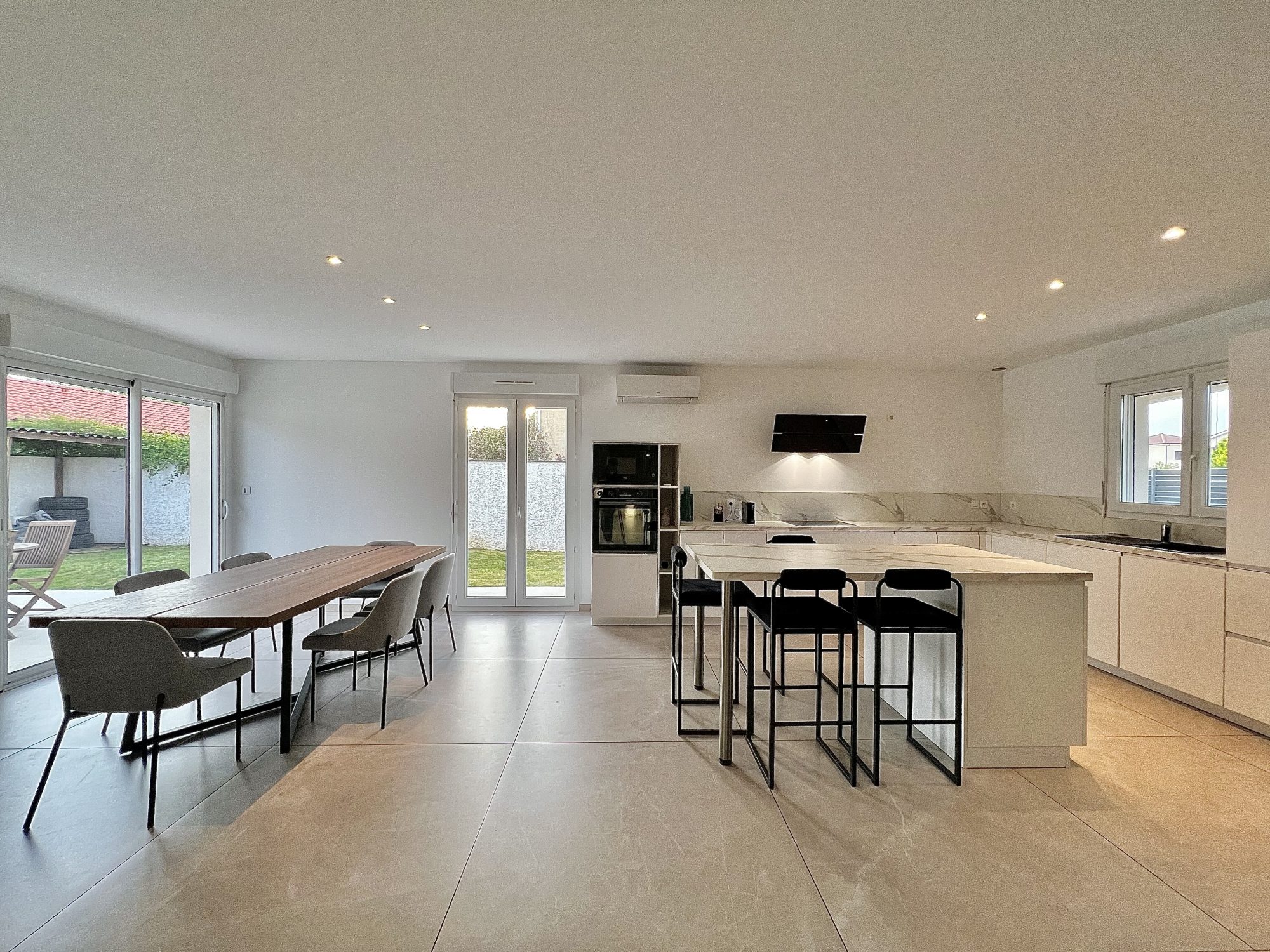 Pièce de vie traversante de 47 m2 avec cuisine moderne ouverte