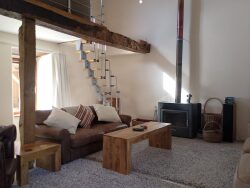 Rez?de?chaussée : Hall d'entrée lumineux 24,7 m² Cuisine / séjour 44,1 m², poêle à bois, cuisine moderne équipée, plaque gaz 5 feux Buanderie 6,3 m² Dégagement 7,9 m² Salle à manger 20,2 m², portes-fenêtres Chambre 1 : 18,3 m², étagères intégrées, mur en pierre, poutres Cellier 3,8 m² Salle d'eau 3,7 m² Séjour 39,7 m², grand poêle à bois, portes-fenêtres sur jardin arrière, double exposition, hauteur sous plafond double avec escalier vers mezzanine 13,99 m²