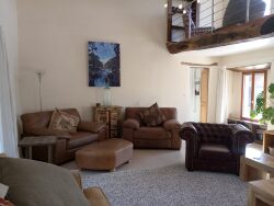 Agencement : Rez?de?chaussée vaste hall d'entrée, grand séjour traversant avec poêle à bois et mezzanine, chambre et salle d'eau en rez?de?chaussée, salle à manger et grande cuisine ouverte / salle à manger avec buanderie séparée. L'escalier en bois mène à 3 chambres supplémentaires (dont 2 avec salles d'eau privatives) et à une suite parentale avec dressing et salle de bains attenante.