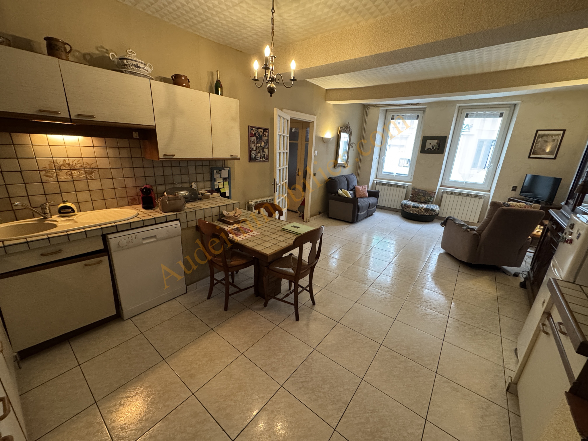 Pièce de vie lumineuse d'environ 30 m2 avec cuisine américaine semi-équipée