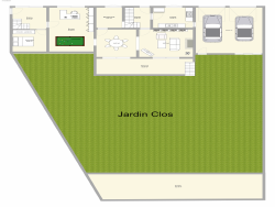 Séjour convivial de 60 m2 (bureau, bibliothèque, salon de musique, salle à manger, salon avec cheminée ouverte donnant sur le jardin) Cuisine indépendante Espace rangement Une chambre