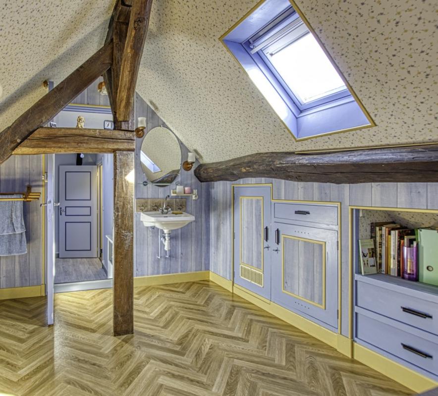 Le dernier niveau révèle tout le charme de l'ancien, avec ses poutres apparentes. Un palier pouvant faire office de bureau dessert une seconde chambre sous les toits, accompagnée de son WC privé. Enfin, une cave voûtée vient compléter ce bien, idéale pour le stockage.