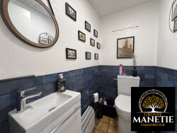 RDC: Couloir donnant accès à un salon-séjour avec cheminée feu de bois, une cuisine aménagée et équipée, un wc indépendant et une buanderie.