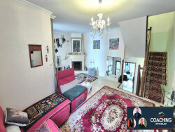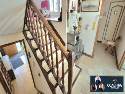 A l'étage: un séjour (salon/salle à manger), un balcon, une grande cuisine toute équipée, une salle d'eau, un wc séparé, placards.