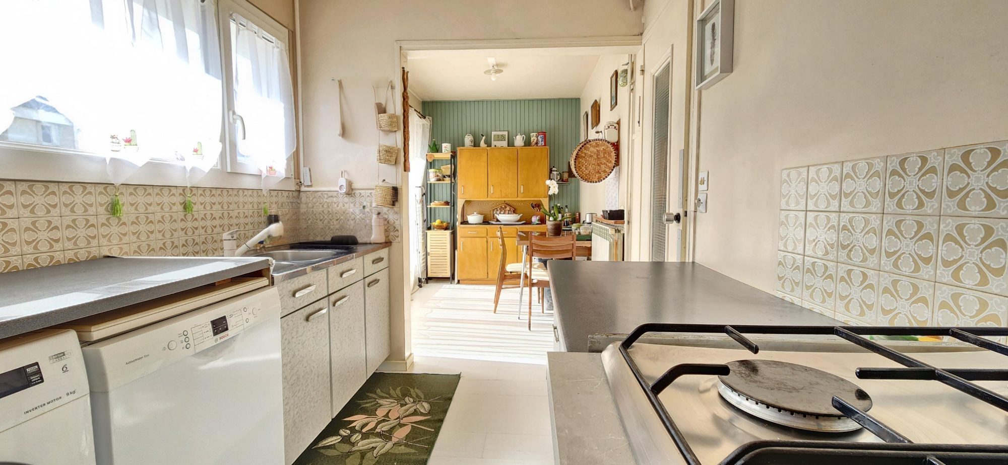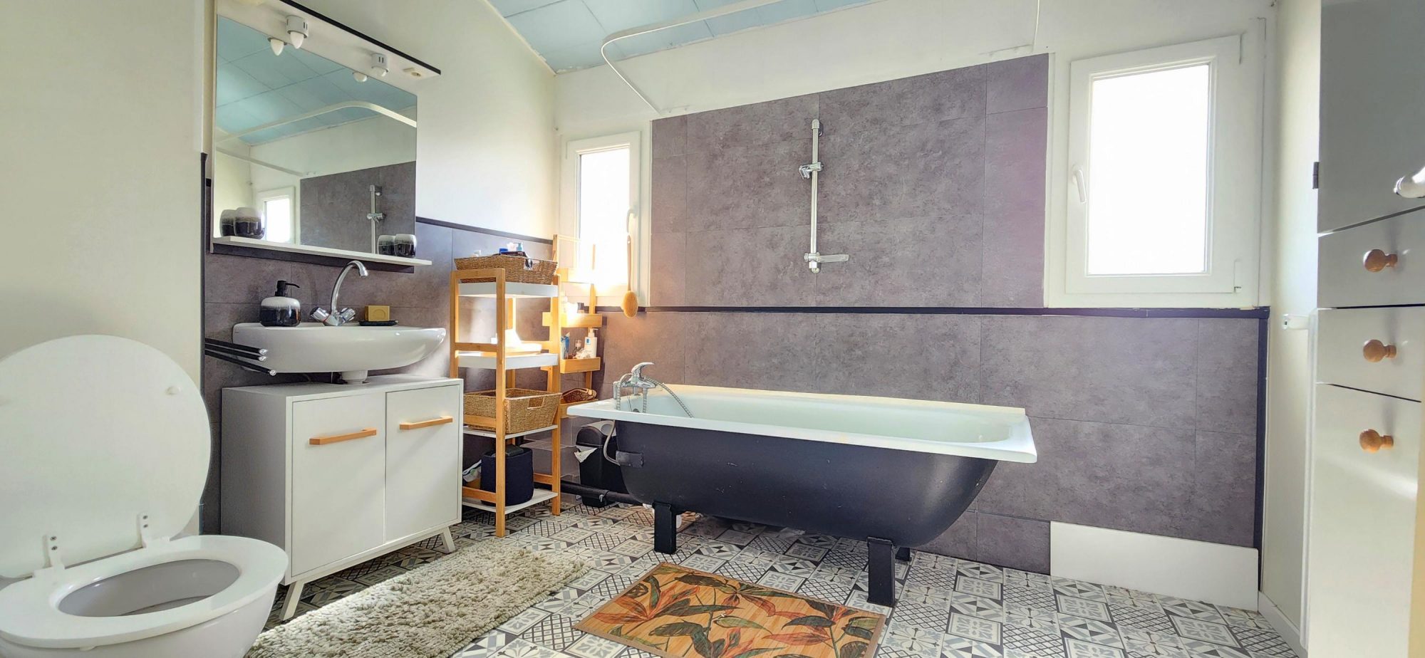Au niveau supérieur, vous découvrirez un très beau séjour lumineux, bénéficiant de deux grandes fenêtres et sublimé par deux poutres maîtresses apparentes au centre de la pièce. La cuisine semi-ouverte prolonge l'espace de vie, renforçant les perspectives visuelles et le volume global. Une salle d'eau avec grande fenêtre apporte lumière naturelle et ventilation, tandis que les WC séparés, idéalement positionnés, disposent eux aussi d'une ouverture sur l'extérieur.