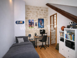 Depuis le palier du premier étage, un escalier sur mesure en fer forgé avec marches en chêne massif, mène à l'étage supérieur. Celui-ci accueille une très belle chambre bénéficiant à la fois d'un velux et d'une fenêtre, avec pierre apparente et une agréable hauteur sous plafond. Une seconde chambre, plus intime, dispose également d'un velux, de murs en pierre et d'une belle hauteur sous plafond, offrant un véritable esprit cocooning sous les toits.