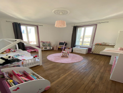 Rez-de-chaussée : vaste hall d'entrée, salon et séjour lumineux, cuisine aménagée et équipée, WC avec lave-mains. 1er étage : palier desservant trois chambres spacieuses avec dressings, une grande salle de bain avec WC. 2e étage (sous combles) : deux belles chambres supplémentaires, une salle de bain, palier. En complément : une cave compartimentée idéale pour le stockage ou l'aménagement d'un espace de rangement.