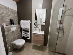 Bourg de Château Thébaud - Maison T3 meublée de 86m² - Elle se compose d'une entrée avec placard, d'un coin buanderie avec machine à laver, d'une salle d'eau avec WC, d'une pièce donnant sur cour. A l'étage : une pièce principale avec cuisine aménagée et équipée (four, plaques de cuisson, hotte, réfrigérateur et lave-vaisselle), deux chambres avec placards, une salle d'eau et un WC. Cour et Garage. Clim réversible. Libre le 01/04/2026. Loyer : 850.00 + 40.00 de provision pour charges (entretien de la pompe de relavage et de la clim)