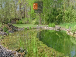 À l'extérieur, le terrain est aménagé autour d'un jardin paysager intégrant un espace d'eau conçu pour la baignade, en continuité avec l'environnement.