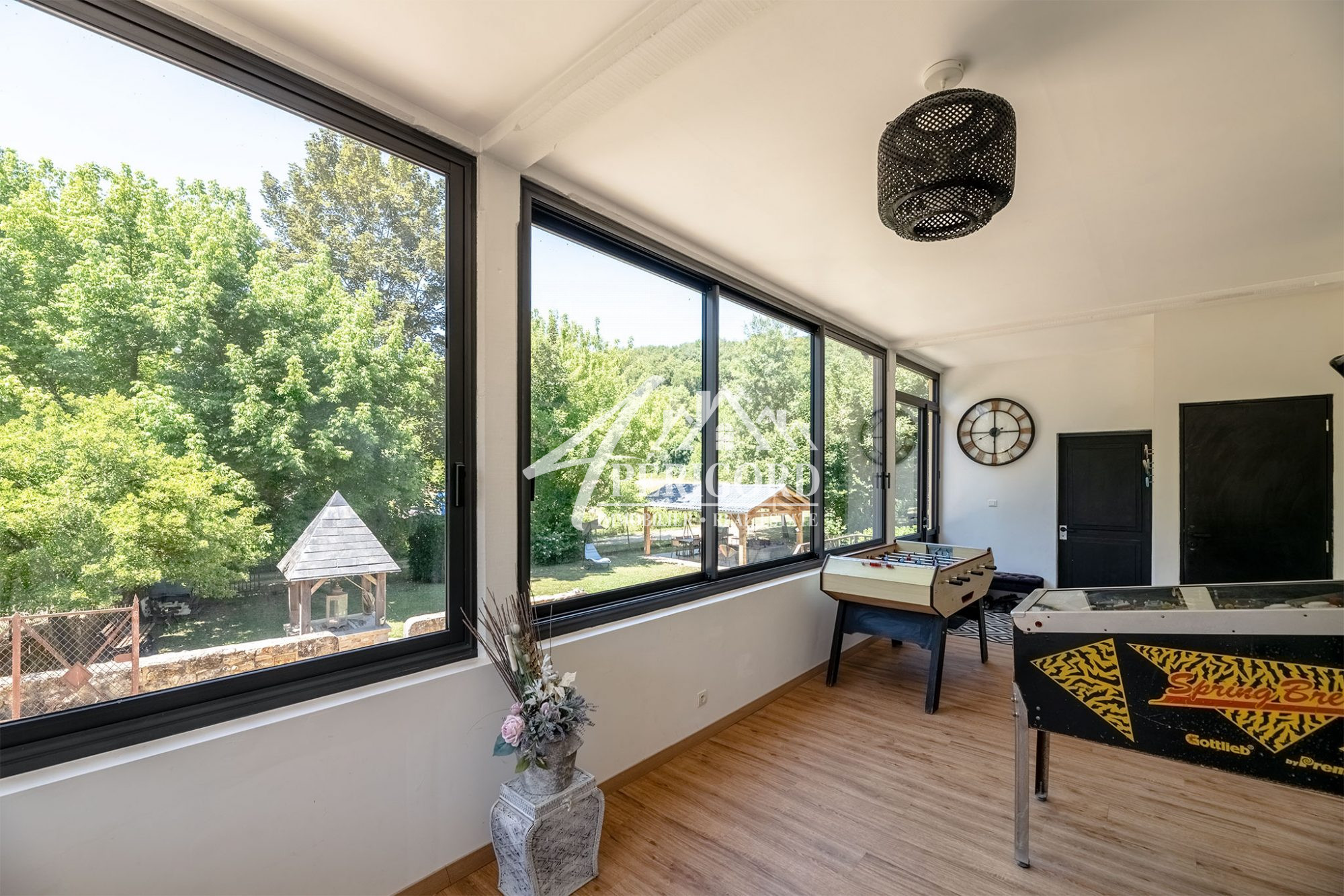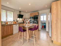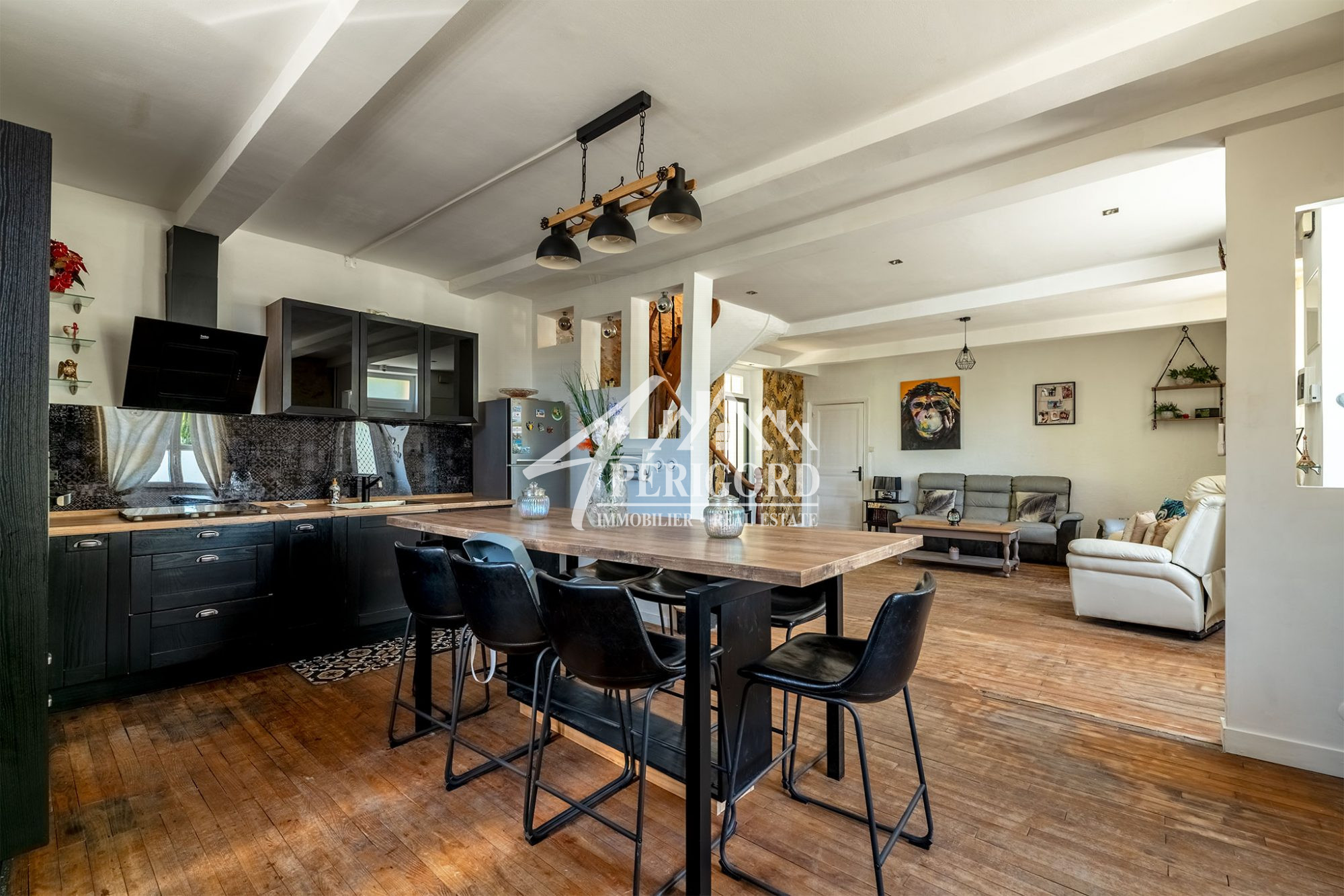 La pièce à vivre spacieuse de près de 70 m² dispose de grandes baies vitrées orientées au sud, offrant une vue magnifique sur la Dordogne. La maison bénéficie également d'une cuisine équipée design, avec un îlot de bar pour les repas rapides.