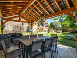 La maison comprend également un garage et un abri voiture, ainsi qu'un terrain clos et arboré de 860 m², avec un accès direct à la Dordogne.