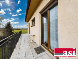 À l'étage vous trouverez une cuisine avec un accès à un 1er balcon donnant l'accès direct au jardin. Un salon-séjour spacieux de 32 m² baigné de lumière, deux chambres dont une dotée d'un balcon, une salle de bains et un WC séparé. Depuis cet étage, la vue dégagée sur un pré apporte une véritable touche de sérénité.
