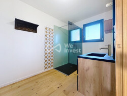 Les ouvertures en PVC et aluminium et les portes à double vitrage assurent une isolation thermique et phonique optimale, complétée par une isolation en laine de bois. Le poêle à granulés est le moyen unique et suffisant pour chauffer toute la maison.