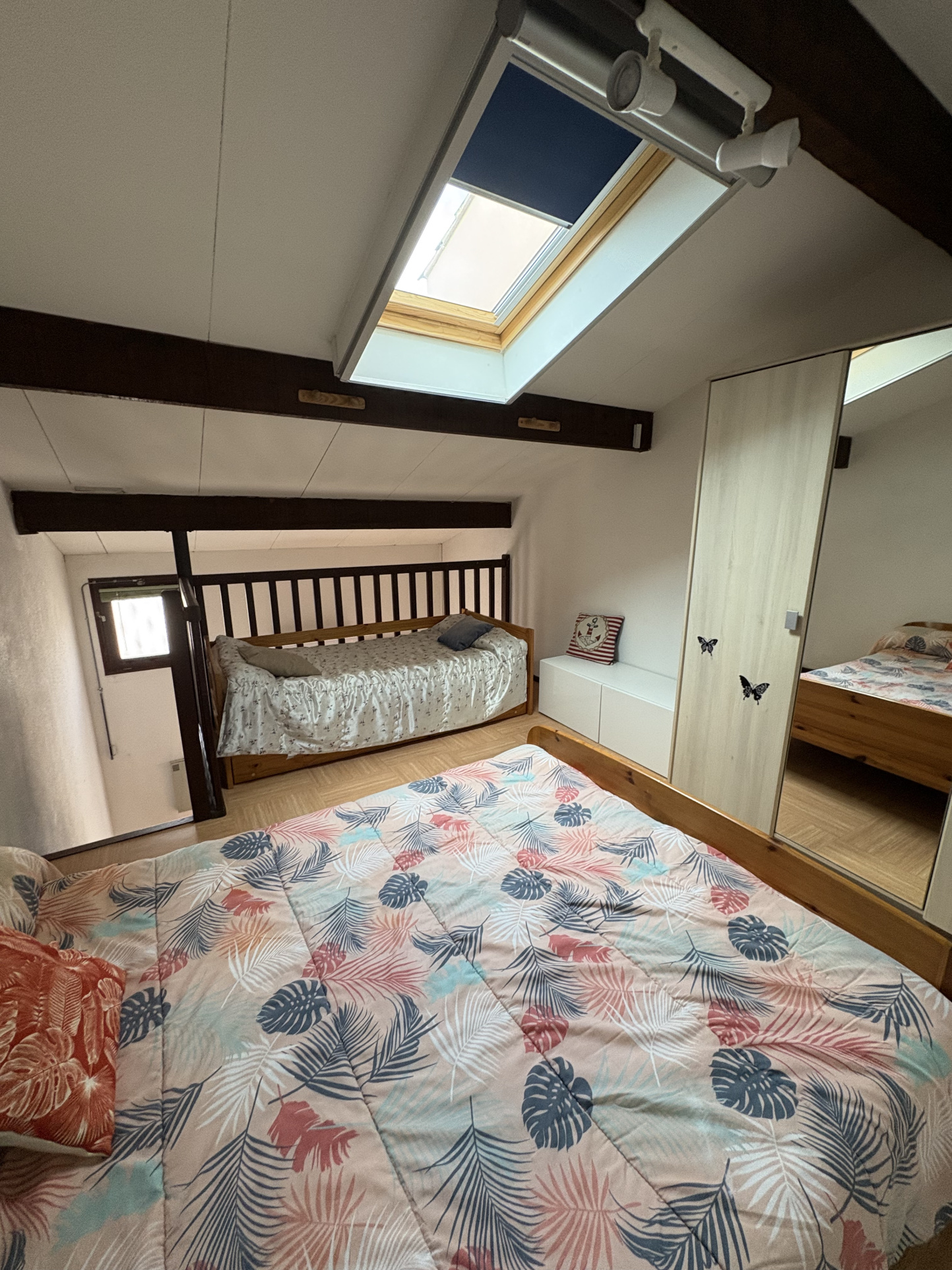 A l'étage : une chambre et une grande mezzanine, idéale pour accueillir enfants ou amis