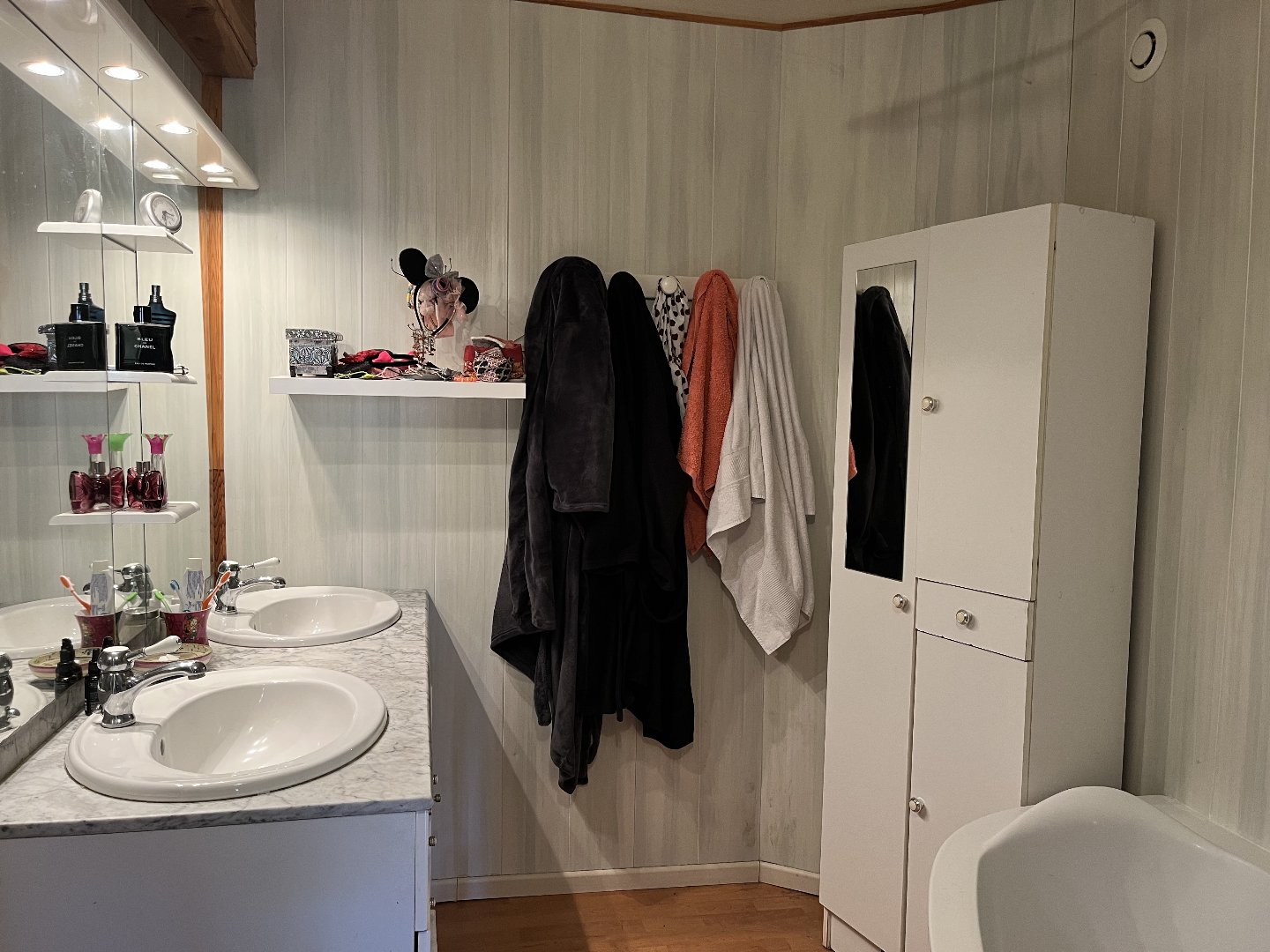 A l'étage se trouve une grande pièce pouvant servir de 4ème chambre ou pouvant être aménagée en studio indépendant. En effet, l'étage se compose de ce grand espace, d'une salle de bains (avec douche, baignoire, simple vasque et wc) ainsi que d'une pièce pouvant servir de dressing ou de bureau et des combles aménageables.
