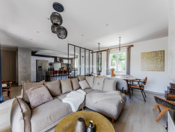 D'une surface de plus de 160 m², la maison se compose : Au rez-de-chausséeUne cuisine dinatoire chaleureuse, pensée pour les moments de partageUne buanderie / cellierUn salon cosy avec poêleUne superbe pièce de vie de plus de 35 m², avec cheminée, généreusement baignée de lumière À l'étageTrois chambres, chacune avec sa salle d'eau privative dont une grande chambre parentale avec espace dressing.