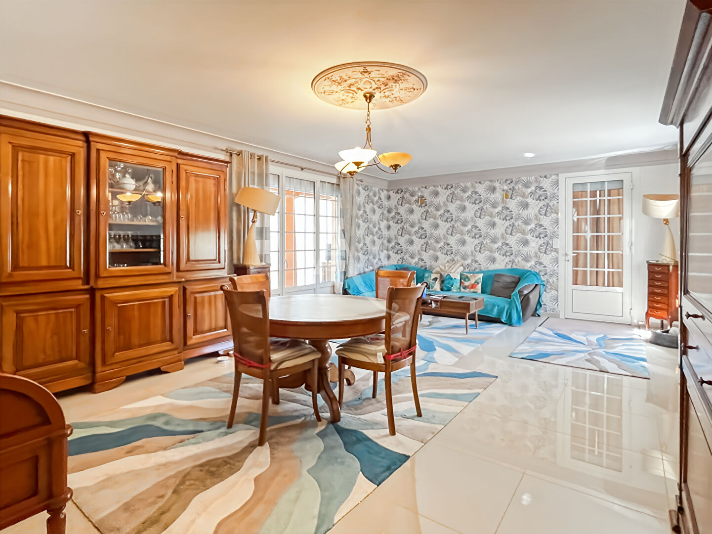 Vaste pièce de vie de 60 m2 : salon/salle à manger, cheminée avec insert, lumière traversante, belle hauteur sous plafond avec mezzanine
