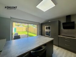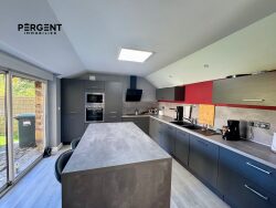 Elle se compose d'une entrée avec rangement, un accès direct au salon/ salle à manger avec poêle à granulés, le tout ouvert sur la cuisine équipée et aménagée, un WC et une buanderie/chaufferie.