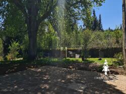 Sur l'avant de la maison : cour pavée avec un magnifique tilleul, offrant une belle ombre l'été.