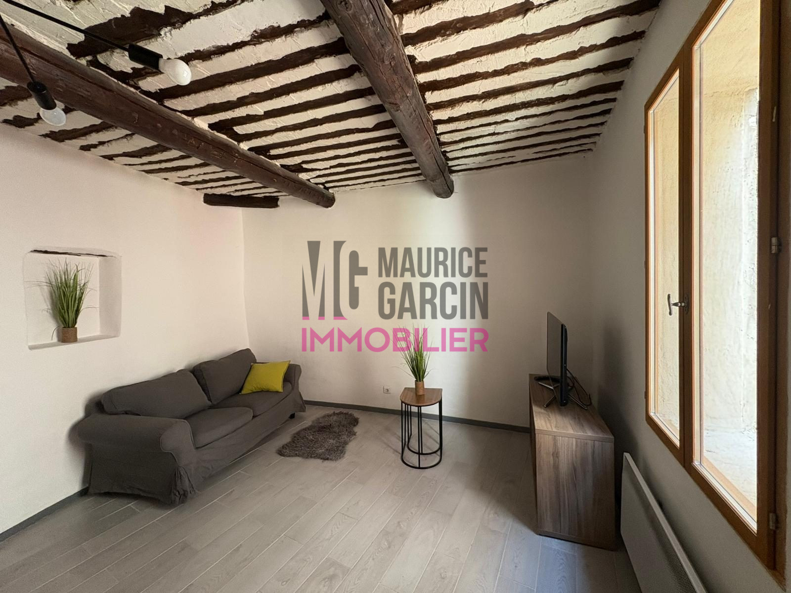 1er étage : Salon cosy et chaleureux de 15 m² avec plafond à la française, cuisine aménagée et équipée de 6 m². Fenêtres en double vitrage bois et volets bois.