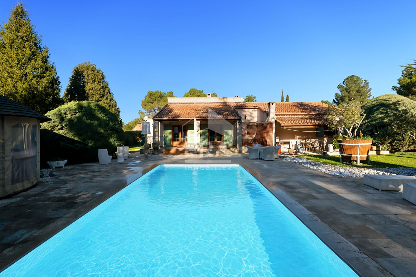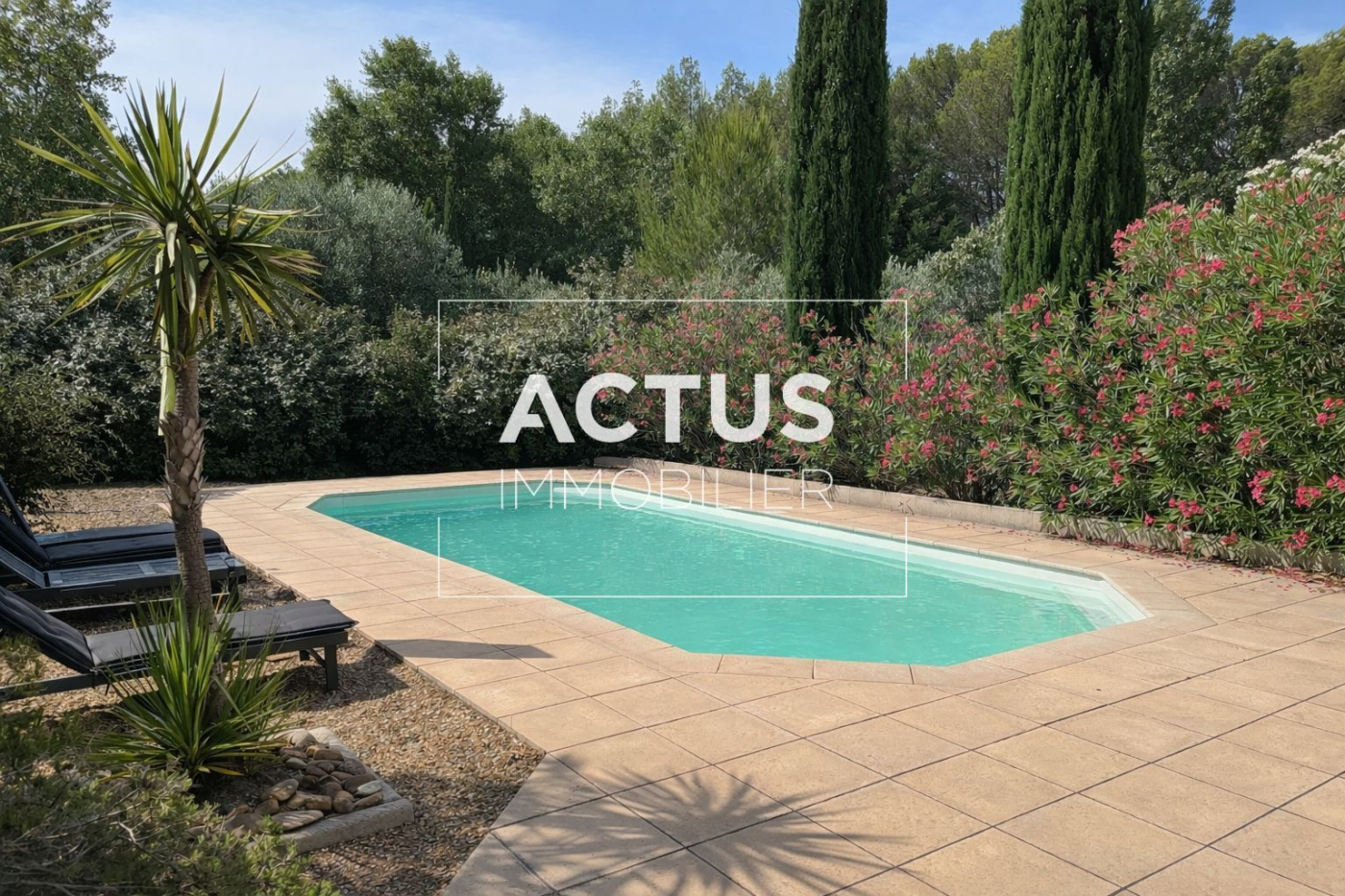 La piscine, construite en 2022, s'étire face au soleil, offrant une eau couleur lagon, sans aucun vis-à-vis, comme un refuge intime où le temps s'arrête.