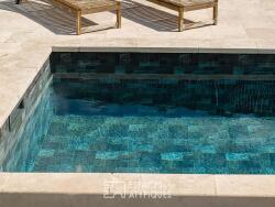 Et puis, au coeur du jardin, à proximité immédiate des pièces de vie, une terrasse mêlant bois et pierre entoure la piscine chauffée de 2,5 x 7,5 m. Elle vous attend pour des baignades d'été et des moments conviviaux.