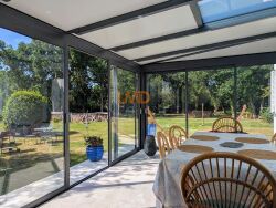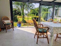 La maison d'environ 120 m2 très lumineuse se compose au rez-de-chaussée d'une entrée séparant l'espace de jour et de nuit, une cuisine équipée américaine, une belle pièce de vie avec poêle à bois donnant sur une véranda neuve, 2 chambres et une salle de bain, un garage servant d'arrière cuisine, une autre pièce qui dessert une chambre à l'étage avec un dégagement.