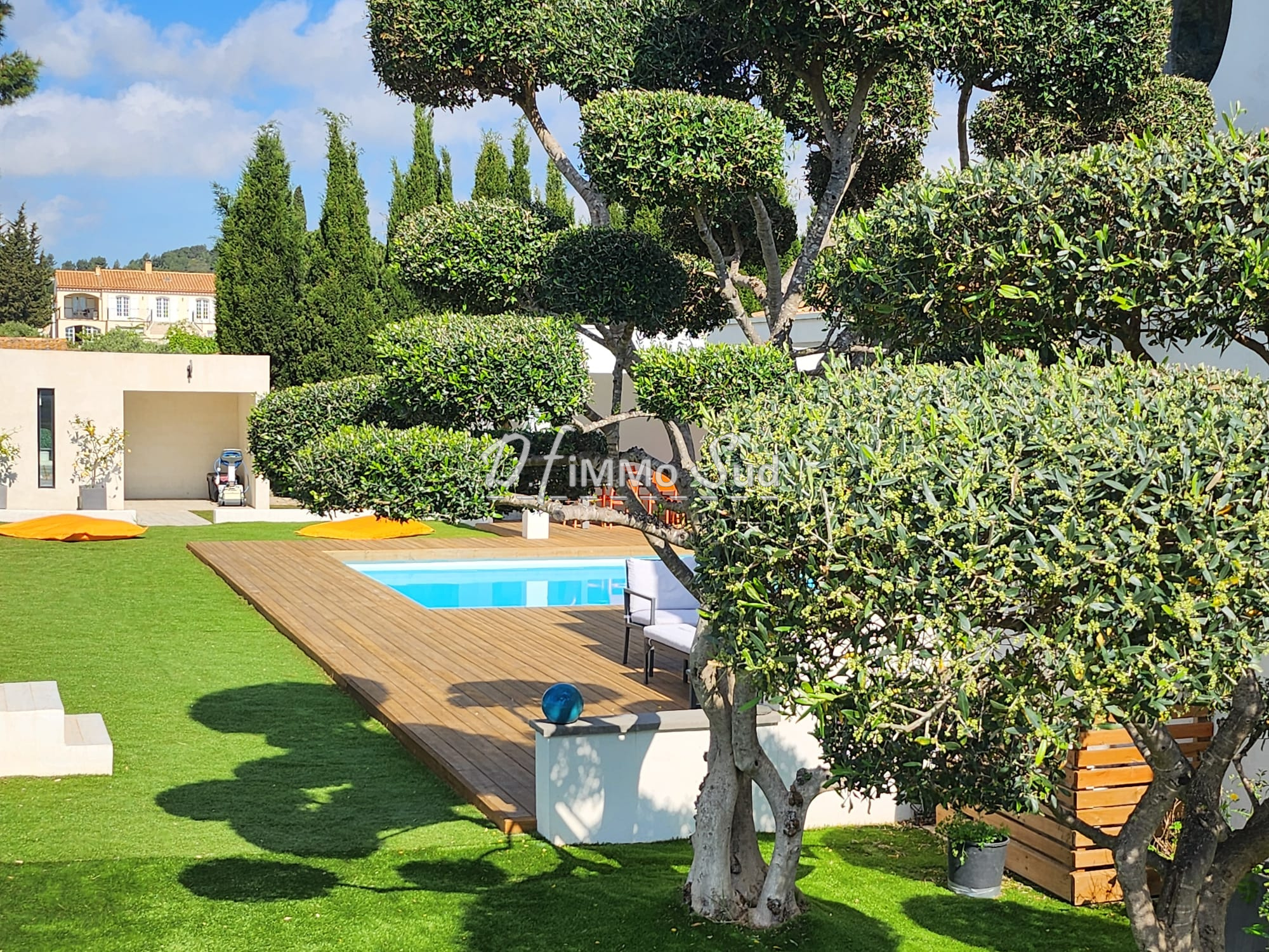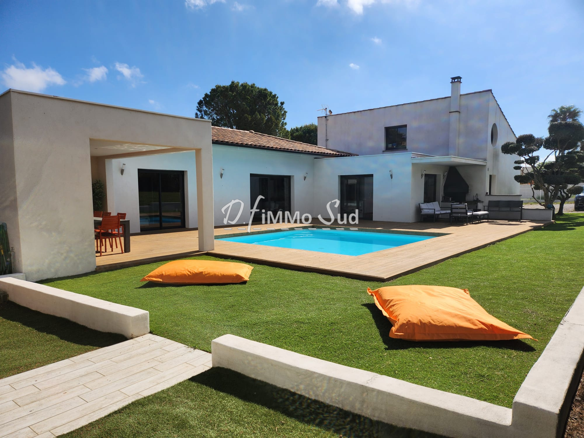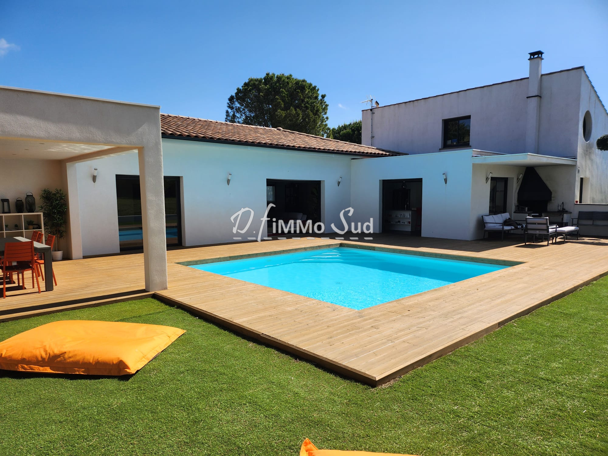 Idéalement située en position dominante, surplombant la garrigue et les montagnes, villa d?architecte atypique et époustouflante offrant 230m² habitable sur une parcelle de 4184m². Dans un charmant village, à 15 minutes de Leucate, une vingtaine de kilomètres de Narbonne. Dotée d?immenses baies vitrées bénéficiant d?une vue spectaculaire et hypnotique, parée de matériaux naturels mêlant le végétal au minéral avec un parquet traditionnel en châtaigner, du travertin et des murs habillés de vieux bois de Douglas, elle offre une pièce de vie de 137m² avec en élément central, une piscine intérieure à débordement, un jardin d?hiver tropical (cocotiers hauts de 7 m, palmier, hibiscus, papayer...). L?espace salon équipé d?un rétroprojecteur et la salle à manger avec son poêle à granule procure une atmosphère chaleureuse et cosy, une cuisine ouverte professionnelle avec son authentique bar chiné et aménagé pour un usage domestique est propice à des moments de partage et de convivialité ; l?ensemble de cette sublime pièce baigne de lumière et offre des vues à couper le souffle. Elle s?ouvre sur une large terrasse, véritable prolongement de l?espace de vie estival, dont une partie est couverte par une pergola de 60m², brasero et terrain de pétanque. La maison est pourvue de 2 suites de plain pied avec salle d?eau attenante et d?une master suite de 27m² avec dressing et salle de bains privative. Une cave à vin naturelle, des espaces dédiés au rangement, un adoucisseur d?eau, un chauffe-eau solaire et un garage de 76m² complètent ce bien d?exception. Elle offre également un fort potentiel d?agrandissement au besoin et la possibilité d?implanter sur le terrain une piscine extérieure.