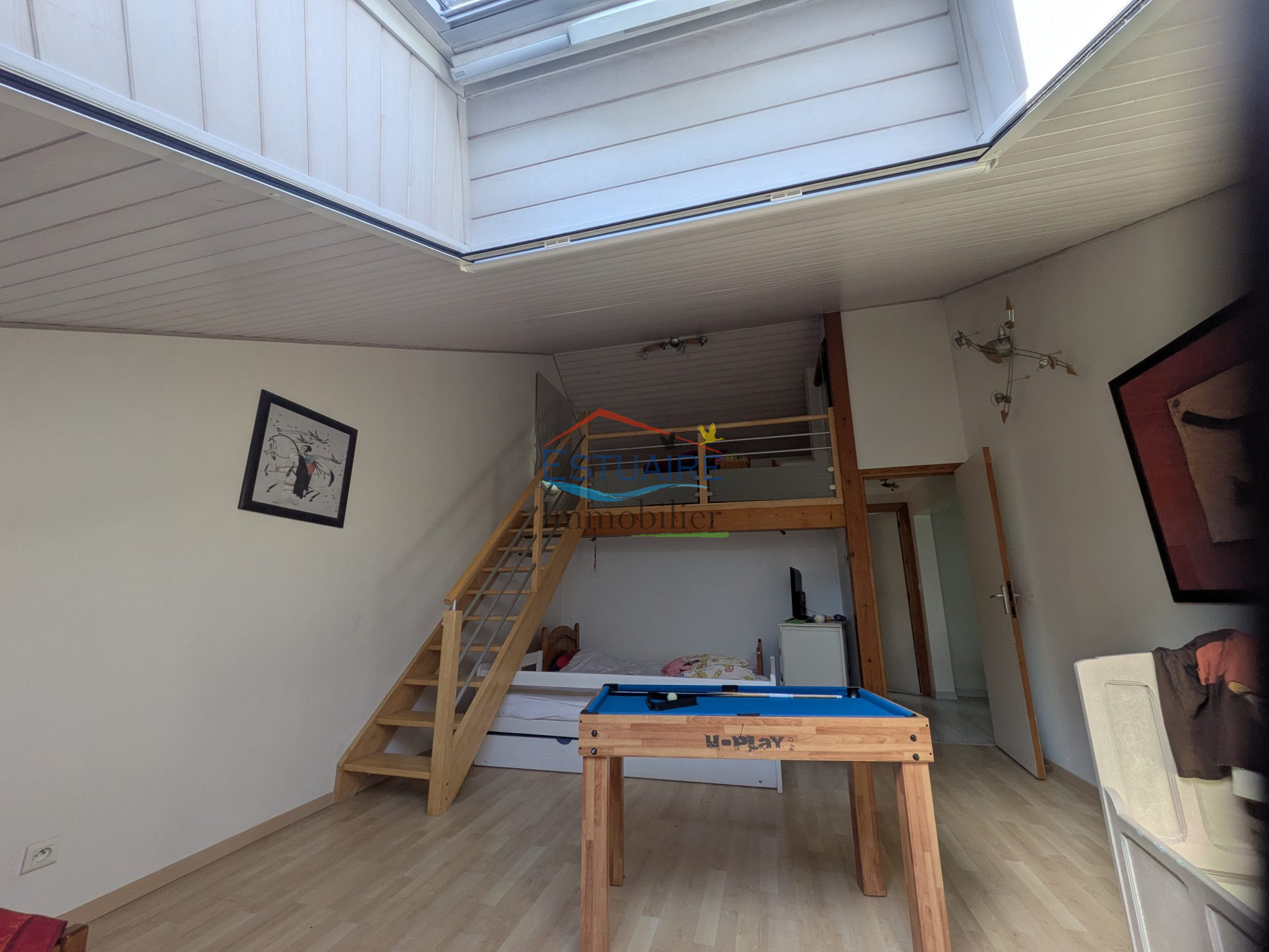 La pièce de vie principale, lumineuse et spacieuse, s'étend sur plus de 50 m² et comprend un salon chaleureux ouvert sur une cuisine contemporaine, parfaite pour recevoir en toute convivialité.