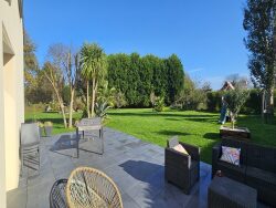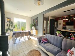 PLEUVEN, à mi-chemin entre Quimper et les Plages de Bénodet et Fouesnant. Maison construite en 2002, de 135m², sur 2153m² de terrain. REZ DE CHAUSSEE : Entrée sur séjour double avec poêle à bois et 2 baies vitrées ouvrant sur la terrasse de 75m² exposée SUD-OUEST, cuisine ouverte aménagée et équipée, arrière cuisine buanderie et garage avec grenier au dessus. Une chambre, une salle d'eau et un wc séparé complètent le RDC. ETAGE : Palier desservant 4 chambres dont une avec coin dressing, une salle de bain et douche double vasque et un wc séparé.