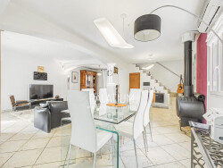 Dès l'entrée, la pièce de vie séduit par ses volumes et sa luminosité. Le séjour et le salon, spacieux et chaleureux, s'organisent autour d'un poêle à bois et s'ouvrent sur une cuisine moderne entièrement équipée, créant un espace convivial.