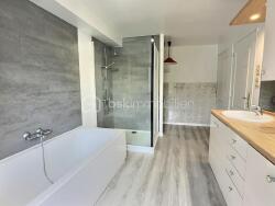 À l'étage, vous trouverez une spacieuse salle de bain équipée à la fois d'une douche et d'une baignoire, ainsi qu'une chambre principale avec dressing.