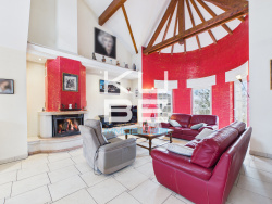 Superbe salon / salle à manger de 45 m2, baigné de lumière, avec grande hauteur sous plafond et cheminée bois diffusant la chaleur dans toute la maison