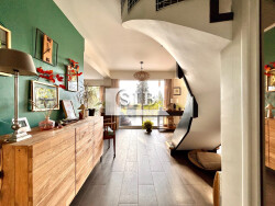 Au rez-de-chaussée, une large entrée avec placard donnant sur un séjour double traversant avec poêle à pellets et un accès direct à la terrasse d'environ 30m² expo plein SUD, une cuisine ouverte aménagée et équipée avec salle à manger attenante et une deuxième terrasse expo EST, un wc indépendant complète ce niveau.