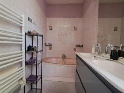 À l'étage, un couloir dessert deux grandes chambres, dont l'une dispose d'un balcon et de la climatisation, parfaites pour des nuits paisibles. Une grande salle de bain avec douche et baignoire vous promet des moments de détente. Une chambre d'amis et une quatrième chambre, idéale pour un bureau ou un espace de télétravail, complètent cet étage. Un deuxième WC séparé est également présent pour plus de confort.