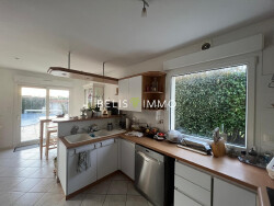 Elle offre au rez-de-chaussée une belle pièce de vie lumineuse, une cuisine aménagée et équipée avec coin repas, une chambre, salle d'eau, WC, buanderie et un double garage. À l'étage, quatre chambres, un dressing et une salle de bains avec baignoire et douche complètent l'ensemble.
