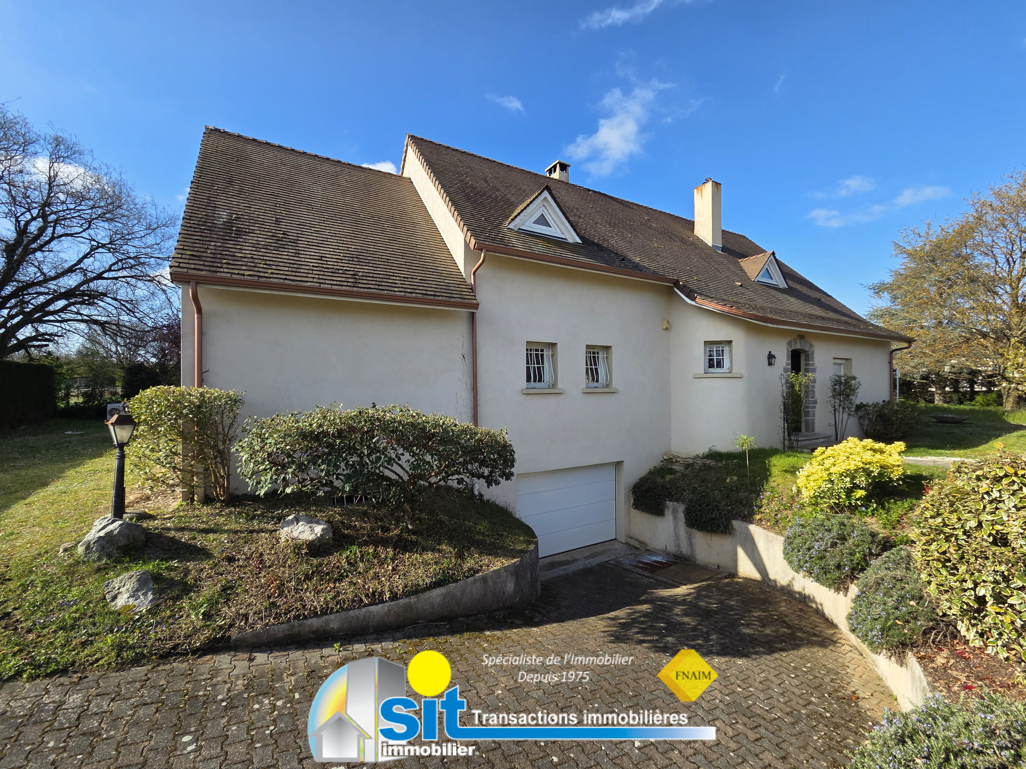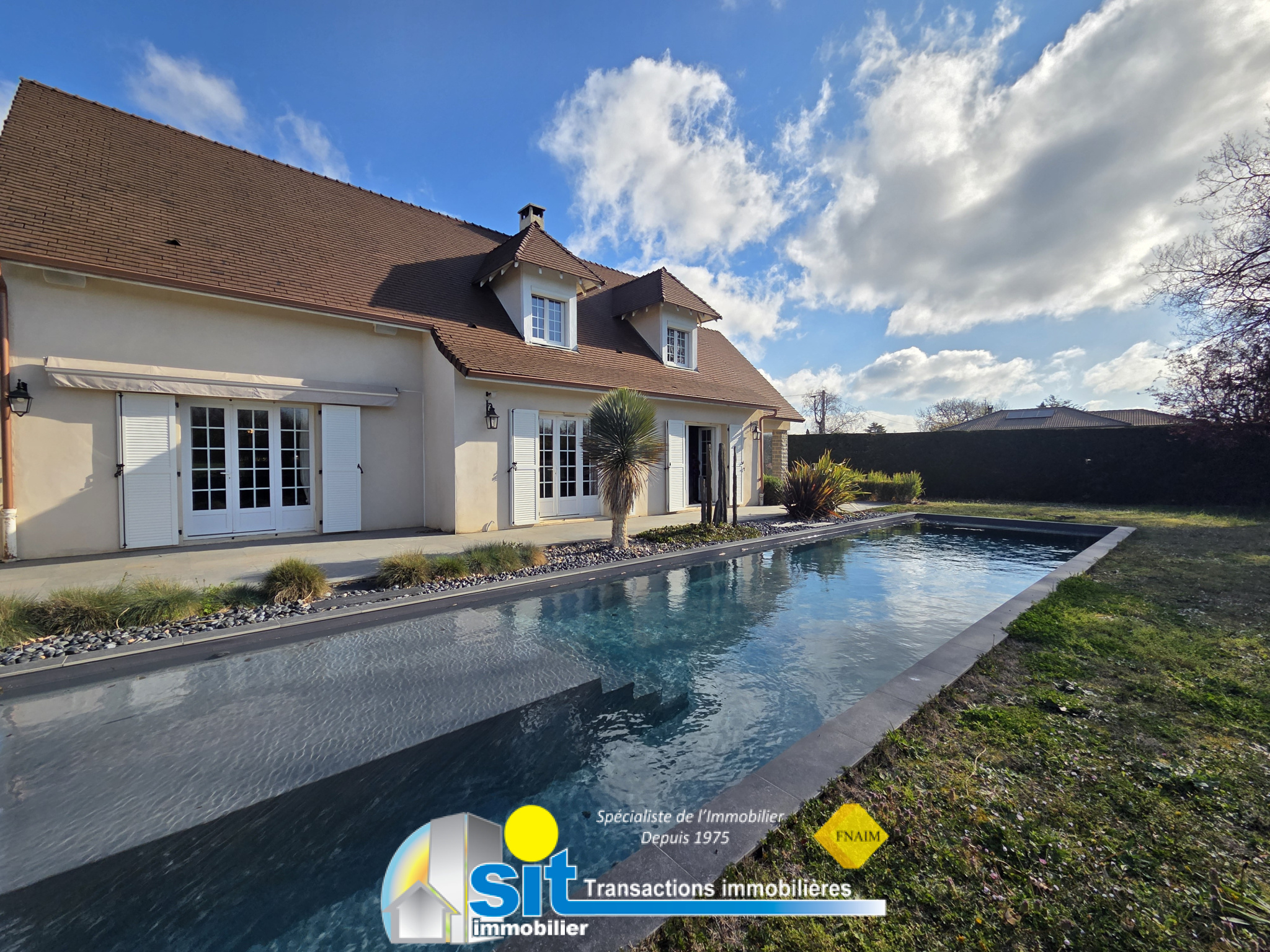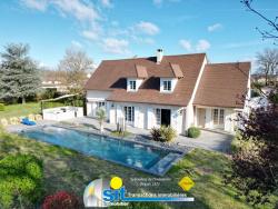 Située dans un secteur résidentiel calme hors lotissement, cette maison familiale de 160 m2 séduit par ses beaux volumes, sa luminosité et son environnement privilégié. Implantée sur un terrain arboré de 1 296 m2, elle offre au rez-de-chaussée un vaste séjour traversant, avec fenêtres panoramiques et vue dégagée, une cuisine équipée indépendante avec cellier donnant accès à une terrasse couverte de 30 m2. Une suite parentale avec salle d'eau et un bureau indépendant, ainsi qu'un WC et un placard d'entrée complètent ce niveau. À l'étage, vous découvrirez trois chambres et une salle de bains avec WC. Le sous-sol de 112 m2, accessible depuis l'habitation ou le garage, offre de nombreuses possibilités : stockage, atelier, bureau ou espace aménageable, et comprend le local technique de la piscine. À l'extérieur, profitez d'un jardin paisible, d'une piscine creusée 7 x 4 m sécurisée, et d'un cadre verdoyant avec vue dégagée, idéal pour une vie de famille au calme. Les informations sur les risques auxquels ce bien est exposé sont disponibles sur le site Géorisques : www.georisques.gouv.fr - Annonce rédigée et publiée par un Agent Mandataire -
