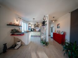 À l'étage, vous profiterez d'une pièce de vie lumineuse et chaleureuse de 47 m², bénéficiant d'une exposition est-ouest avec un accès direct au balcon de 10 m². Le coin nuit se compose de trois chambres, d'une salle d'eau et d'un WC indépendant.
