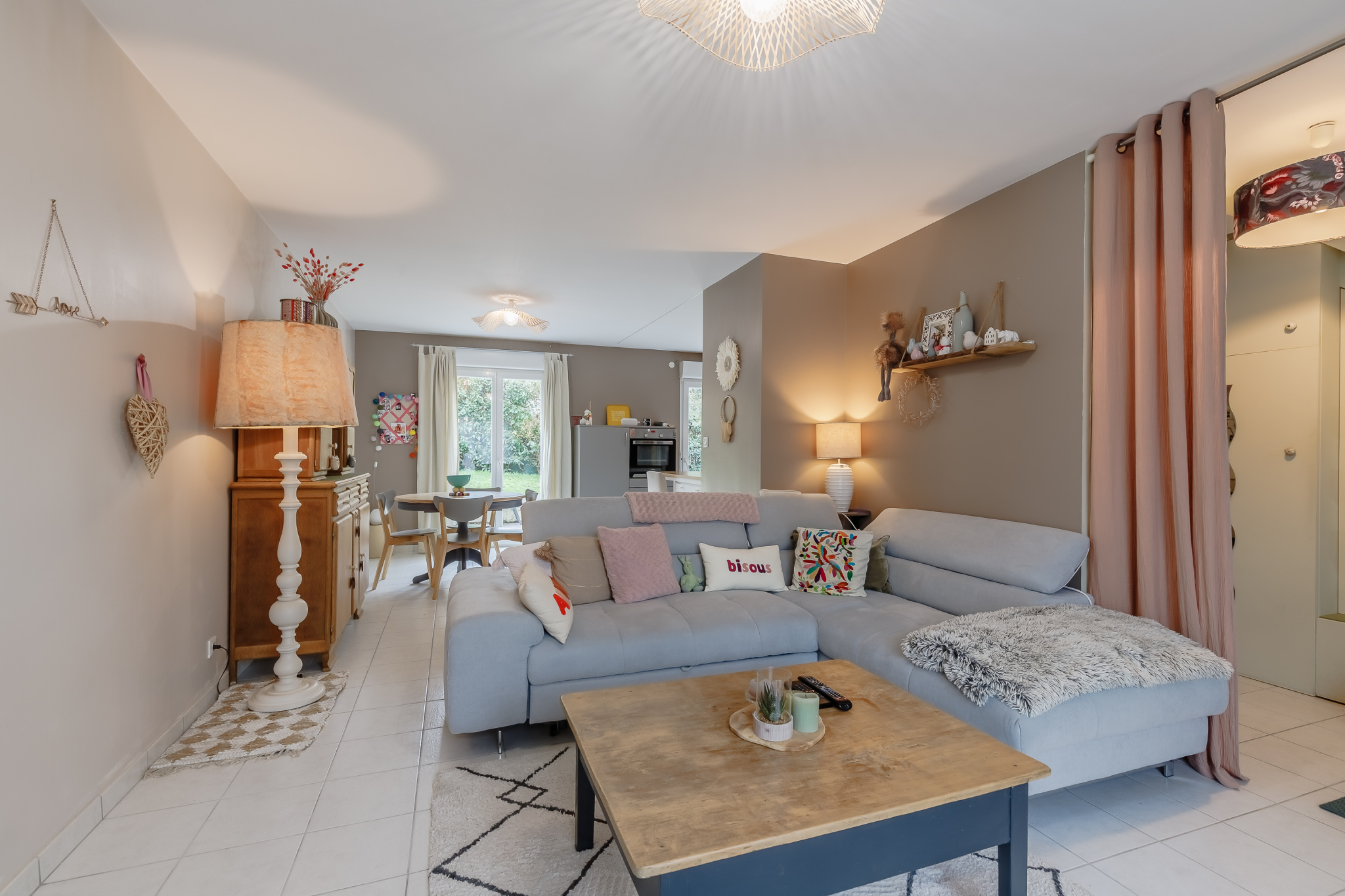 Au rez-de-chaussée, une entrée avec vestiaire mène à un vaste salon-séjour avec cheminée, une cuisine indépendante ouverte sur une terrasse équipée d'un store banne, deux chambres, une salle de bains( baignoire, douche, double vasque ), des toilettes séparés et un débarras.