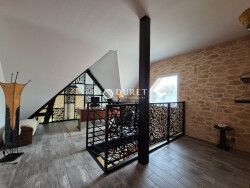 À l'étage, une mezzanine distribue deux chambres avec placards, un bureau avec rangement, une salle de bains avec douche et double vasque, et un second WC séparé.