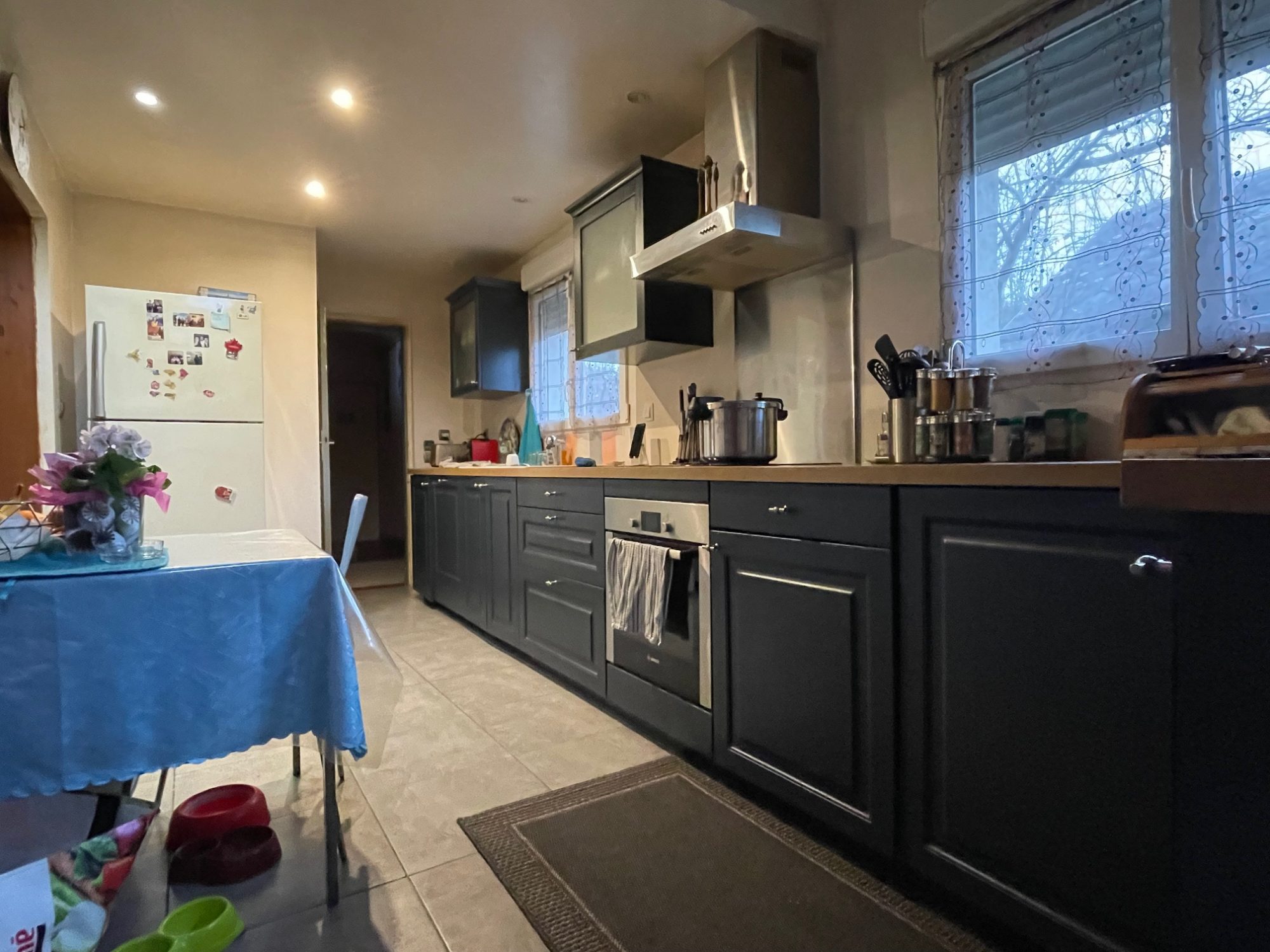Au rez de chaussée : entrée, une salle à manger avec insert donnant accès à une belle et grande terrasse carrelé exposé plein sud.