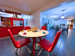 Double salon-séjour sur l'extension, lumineux, avec double cheminée Cuisine ouverte sur une salle à manger 2 chambres de plain-pied très spacieuses dont une avec espace mezzanine Salle de bain avec douche et baignoire ainsi qu'un meuble double vasque 2 WC avec lave-mains Buanderie