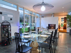 Double salon-séjour sur l'extension, lumineux, avec double cheminée Cuisine ouverte sur une salle à manger 2 chambres de plain-pied très spacieuses dont une avec espace mezzanine Salle de bain avec douche et baignoire ainsi qu'un meuble double vasque 2 WC avec lave-mains Buanderie