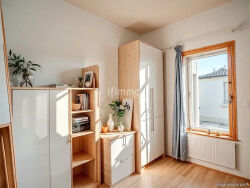 Au rez-de-chaussée, une terrasse avant permet d'accéder à l'entrée et à la cuisine aménagée et équipée, exposée nord, tandis que le séjour, exposé sud, s'ouvre sur une seconde terrasse sans vis-à-vis, parfaite pour profiter des beaux jours. Vous y trouverez également un WC avec coin buanderie ainsi que de nombreux rangements.
