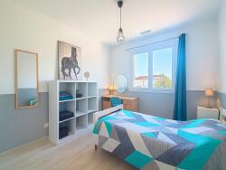 La maison offre des espaces de vie pratiques et agréables, avec un séjour lumineux et climatisé, 4 chambres spacieuses permettant à chacun d'avoir son intimité, et un poêle à bois qui ajoute une touche chaleureuse pour les soirées en famille. Les volets roulants électriques centralisés facilitent le quotidien, et le garage assure un stationnement sécurisé.
